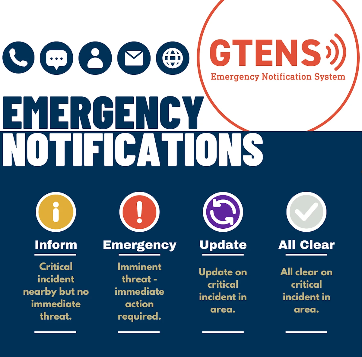 The Georgia Tech Emergency Notification System (GTENS) is the system Georgia Tech uses to communicate in an emergency with the campus community. Within the last year, we transformed GTENS from sending one type of message to being more inclusive of the diverse event types that impact our campus. Generally, you will see two different kinds of GTENS: GTENS Inform or GTENS EMERGENCY! When you see these different monikers we want you and your student to be able to identify immediately if action needs to be taken.